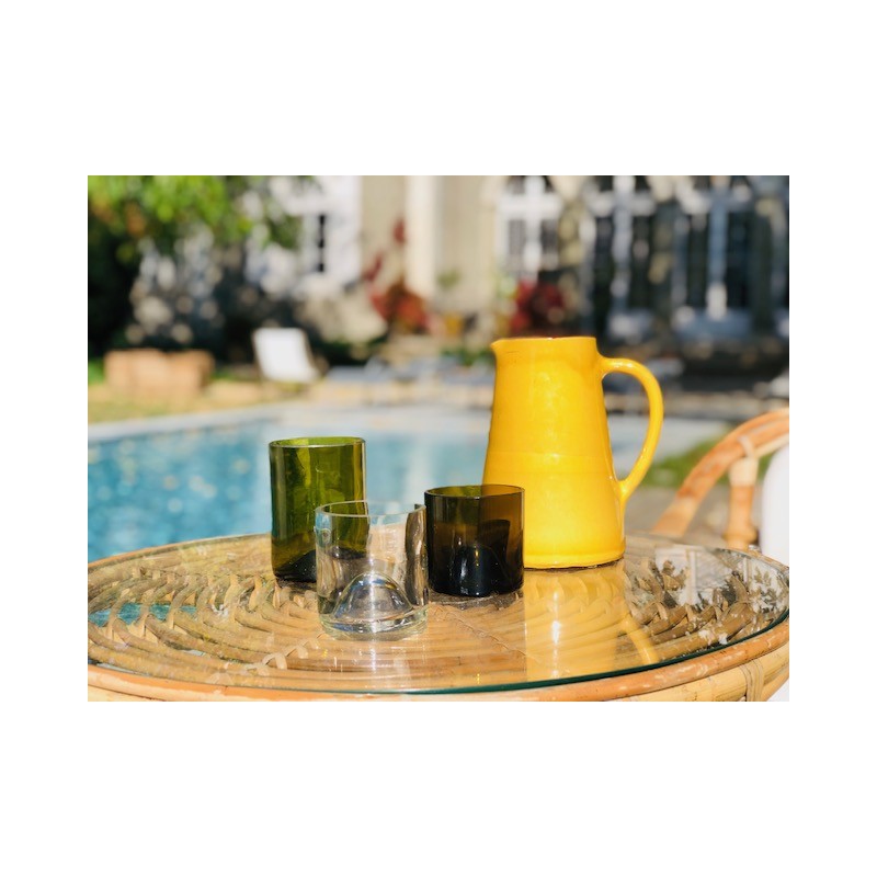 Nos verres sont réalisés à partir de Bouteilles de vins consommées sur place et plus précisément de la cuvée N116 pour les verts et de notre Rosé pour les transparents.